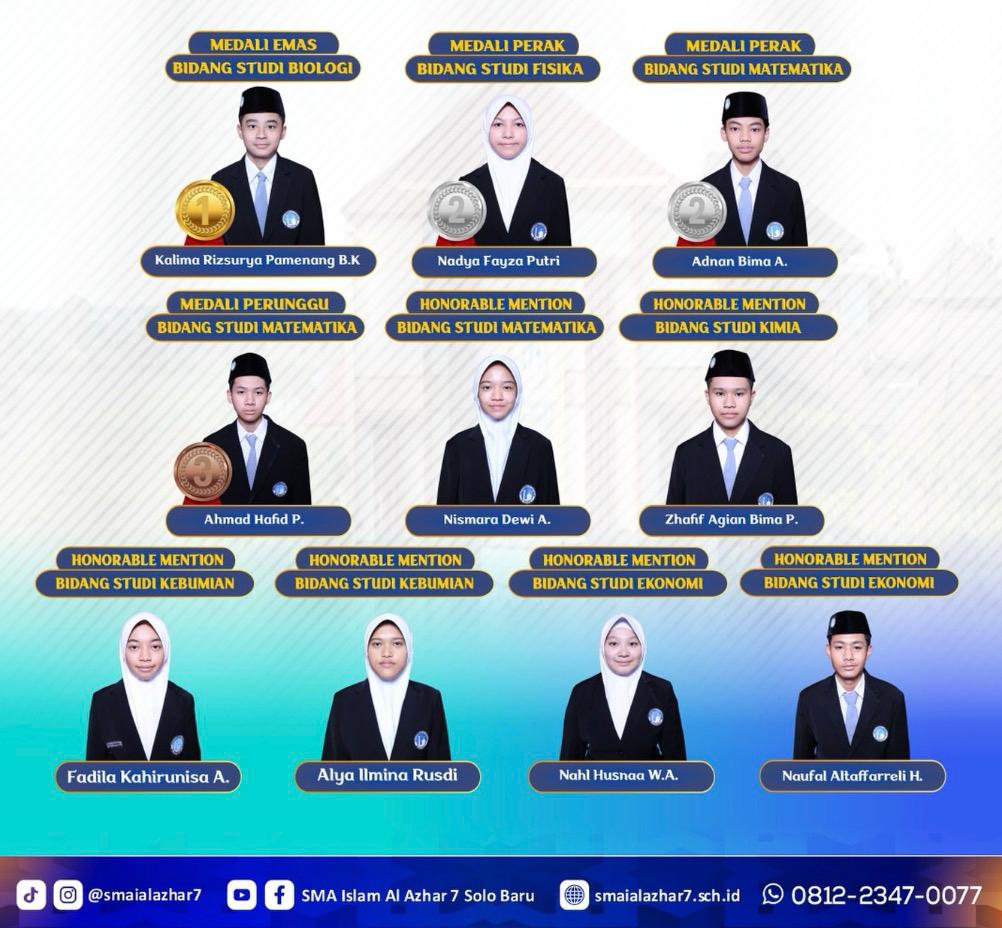 Pada ajang tersebut, murid yang tergabung dalam kontingen SMA Islam Al Azhar 7 berhasil menorehkan prestasi membanggakan di berbagai bidang lomba. Pada bidang Matematika, Ahmad Hafid Pulunggono meraih Medali Perunggu, Adnan Bima Adibrata memperoleh Medali Perak, dan Nismara meraih Honorable Mention. Pada bidang Kimia, Zhafif Agian Bima Pradana berhasil meraih Honorable Mention. Prestasi tertinggi diraih pada bidang Biologi melalui Kalima Riz Surya Pamenang yang berhasil meraih Medali Emas. Sementara itu, pada bidang Fisika, Nadya Fayza Putri memperoleh Medali Perak.
