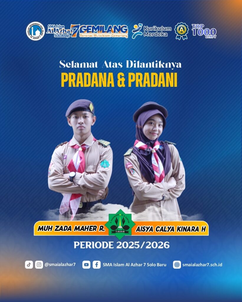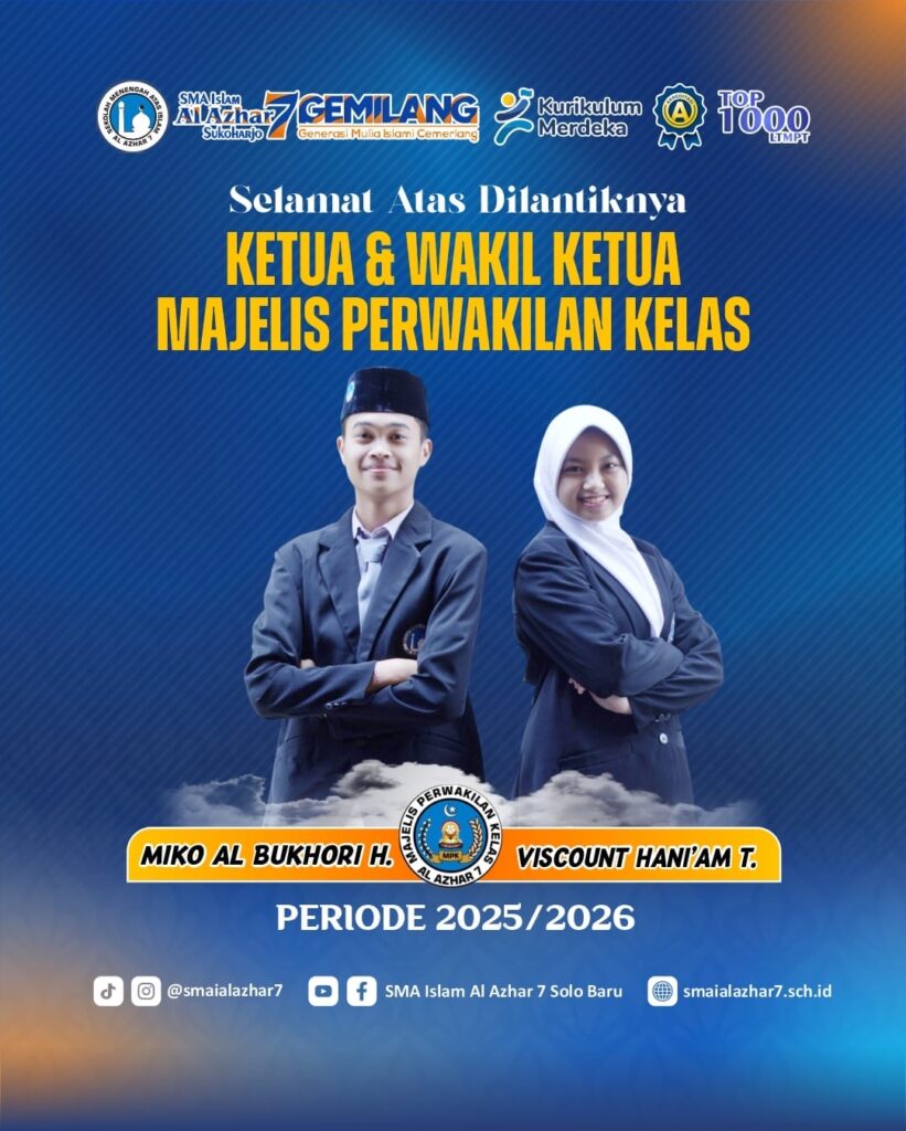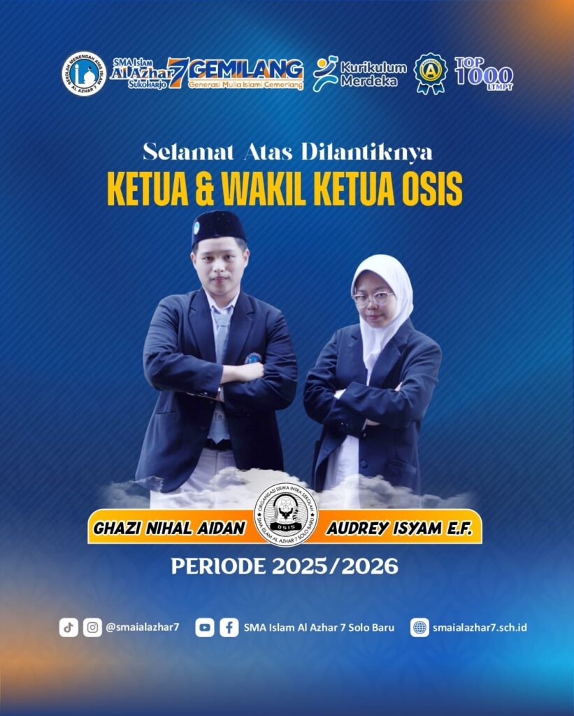 Pada hari Rabu, 22 Oktober 2025, SMA Islam Al Azhar 7 Solo Baru menyelenggarakan kegiatan Pelantikan dan Serah Terima Jabatan Pengurus OSIS, MPK, dan Dewan Ambalan Masa Bakti 2025–2026. Acara yang berlangsung di Lapangan SMA Islam Al Azhar 7 Solo Baru ini berjalan dengan penuh khidmat dan semangat kebersamaan dari seluruh peserta dan tamu undangan.
